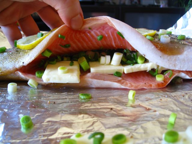 A peek inside — pretty in pink! Simple seasonings — lemon, butter, garlic scapes and scallions.