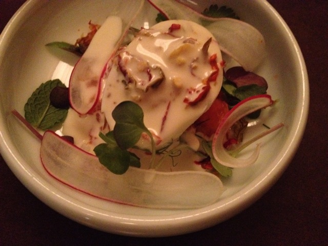 Favorite of the night: king salmon 7-min deviled egg with pickled radish and horseradish creme fraiche — a slightly gooey egg served as the bed for sweet salmon, peppery creme fraiche and refreshingly crunchy radish strips. Everything was right in this bowl.