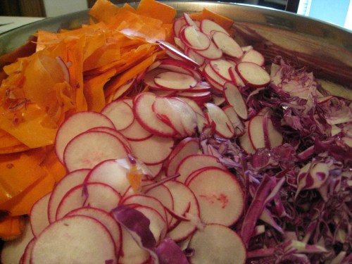 While the rain clouds loomed overhead, I poured the beer and tried to add a little brightness to the evening with an array of colorful market veggies — purple carrots and zebra heirloom tomatoes, oh my!