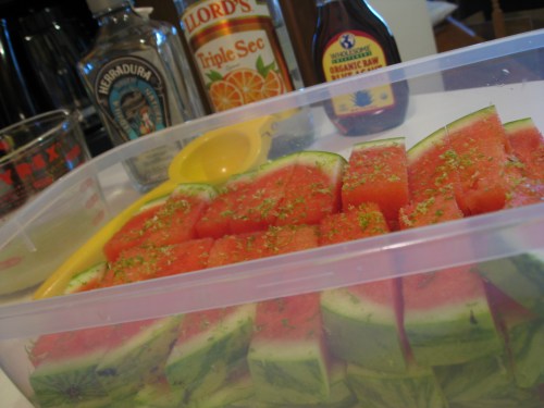 And because it was 90 and humid and we couldn’t rely solely on chilled wine to keep us from sweating, it was time for one of my absolute favorite summer salads. I discovered this genius whole preparation of a “watermelon steak” from the Umami Mart blog and then adjusted for a combination of flavors that I think were made to go together — a little salty feta to counter the sweet melon, the pistachios add a crunch to each bite that would otherwise dissolve in your mouth, a drizzle of aged balsamic for a touch of acidity and a sprinkling of fresh mint because mint and watermelon belong together.