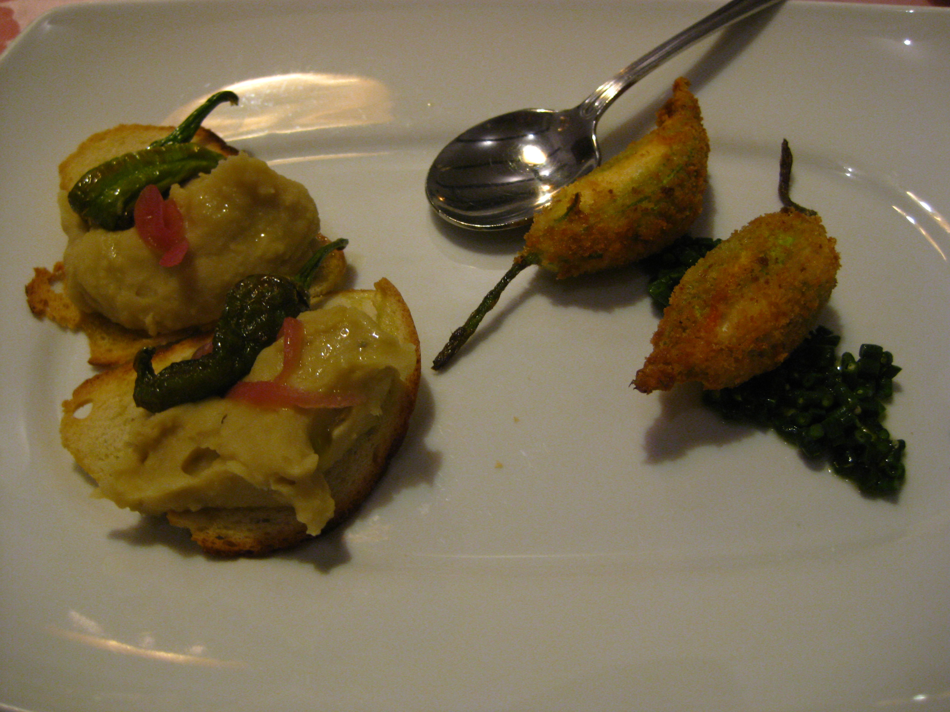 Fava Bean Crostini and Fried Zucchini Blossoms