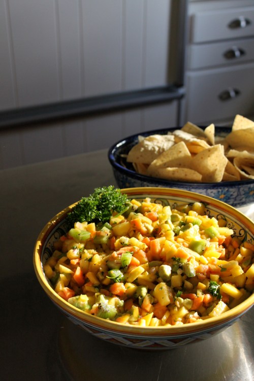 Memorial Day is right around the corner , which means I break out the American flag and fire up the BBQ. Anyone who knows me knows my biggest weakness is tortilla chips with fresh salsa — not the jarred kind that tastes like bland tomato puree or the ‘fresh’ salsa that comes prepackaged at the grocery store, but the pull-your-knife-out and start chopping fresh salsa. I usually do some version of a grape tomato-corn-jalapeno-lime blend, but my cousin recently introduced me to a truly unique recipe with a blend of fruit, citrus and avocado that was both delicious and beautiful — it’s worth the effort of chop, chop, chopping and if you don’t finish it off yourself before it gets to the table, you will definitely impress your guests with something new and unexpected.