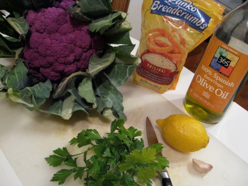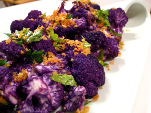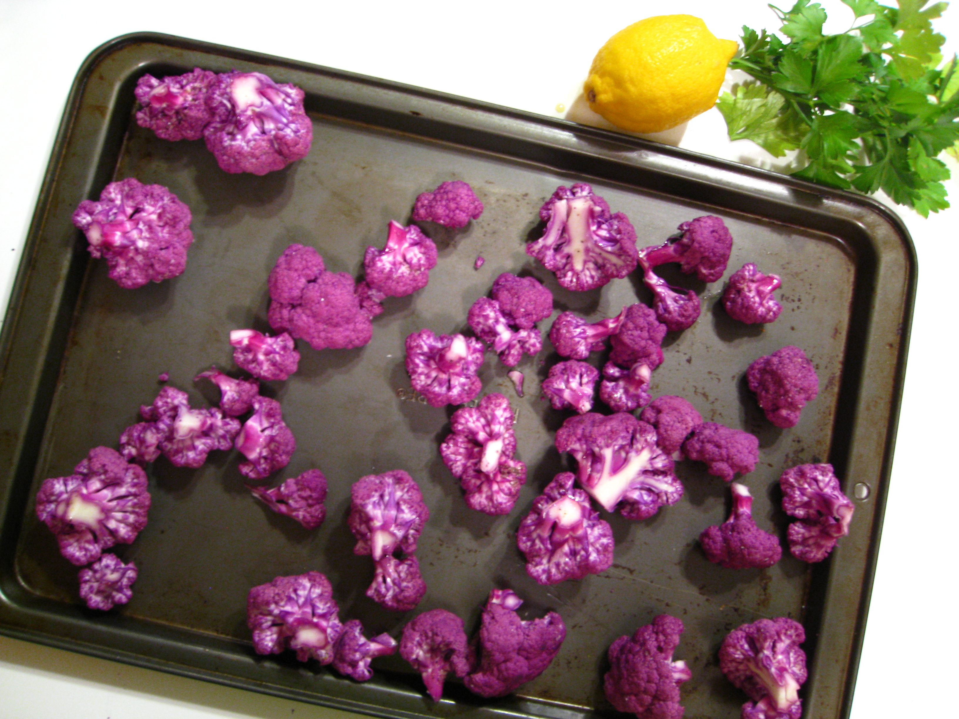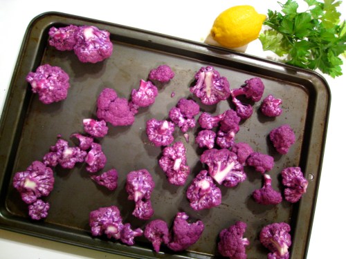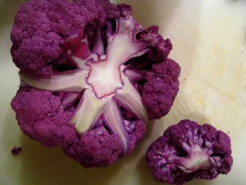 “Say it with cauliflowers.” Because I love you, one great cauliflower recipe begets another this week. For a couple years I’ve had a photo I took of a purple cauliflower hanging on the limited wall space of my NYC kitchen.  And while I was walking through the farmer’s market this weekend, I saw him again. The most stunningly royal purple “graffiti cauliflower.” Let me be clear — this graffiti cauliflower is not purple because of some lame carnation-in-dyed water method, this is the color nature intended! So I bought him, brought him home and consulted one of my favorite food websites Food52 for some inspiration from their week 6 recipe contest: “your best cauliflower recipe.” Just today the recipe below was announced as the winner — and I concur with the crowd!