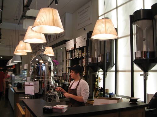 Walk in and bypass the Lavazza coffee bar, which will inevitably have a long line because it is right by the front door. Not far past that long line you will discover another very slick walk-up coffee bar with a large and shiny imported coffee machine that not only looks cool, but makes a mean cup of Giuseppe.