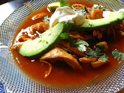 Garnishes: diced avocado, chopped cilantro, finely chopped onion, queso fresco, thinly sliced radishes, sour cream