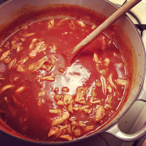 8. Bring to a boil and then reduce to a low simmer for about 30 minutes to an hour. Shred the chicken and set aside.