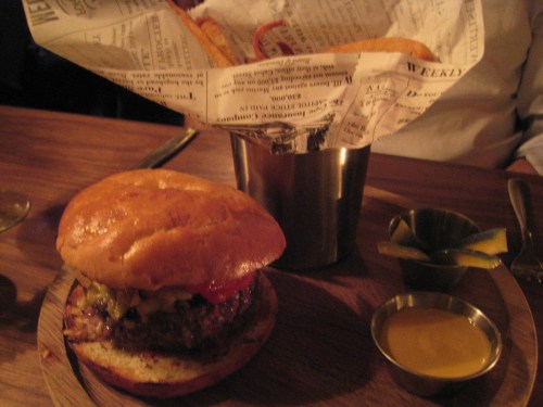 The menu alludes to both Scottish and French cuisine with items such as the rataouille vegetable tart or house smoked scottish salmon. I had a fantastic salad of pickled beets, caramelized yogurt and toasted hazelnuts that I would highly recommend to anyone. The wild striped bass with potato bacon terrine, mustard greens and white wine cream came highly recommended and certainly sounded like a winner, but was sadly not warm by the time it reached my table and was underseasoned. I did have food envy with the MQS burger though. Served with house cut chips and spicy pickles, this is a sure thing {is that french or scottish?}
