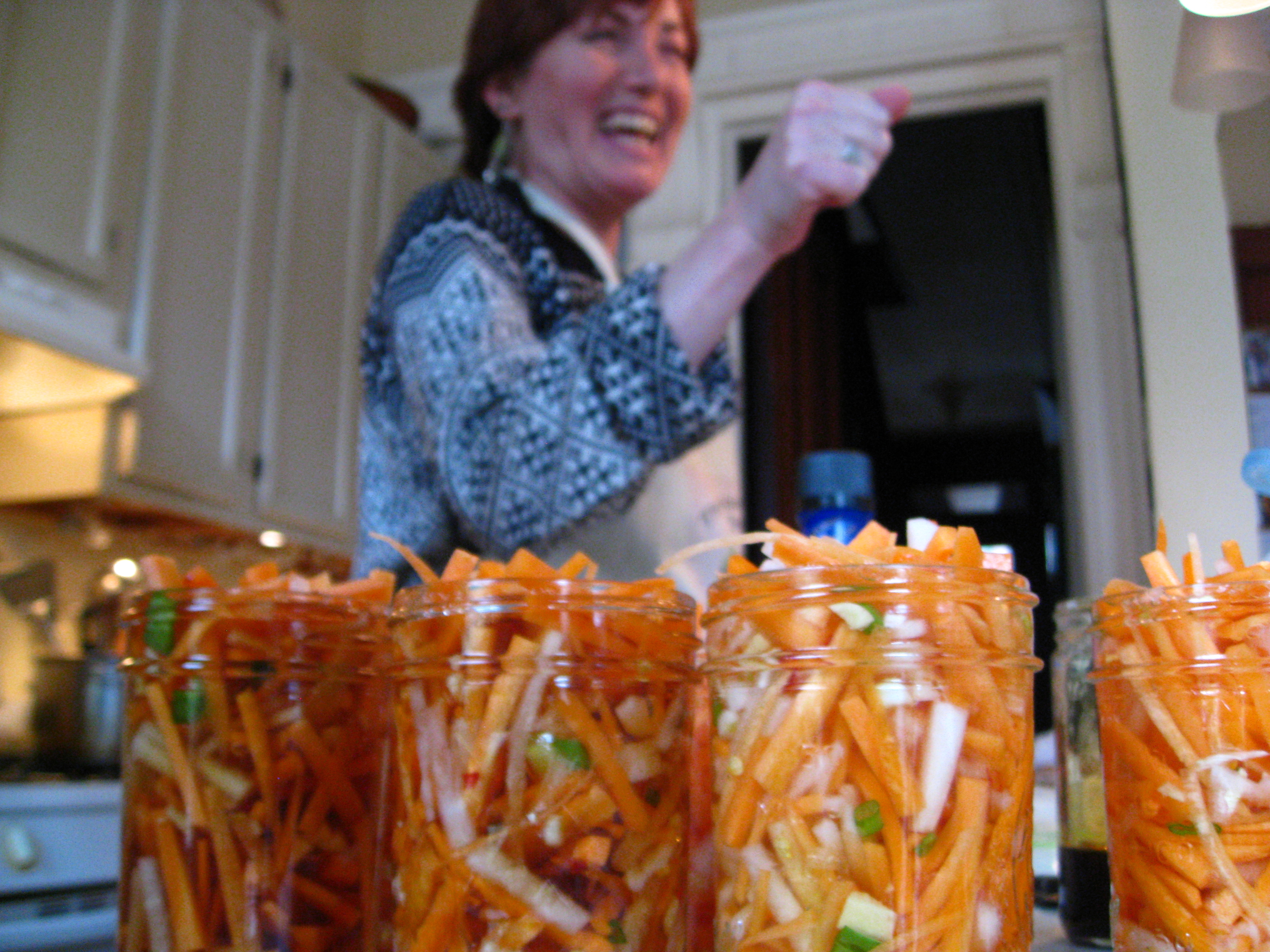 - In a large bowl, toss the carrots, daikon radish, grated ginger, chopped scallion, garlic and red pepper flakes. Pack them into a clean quart or liter glass jar.