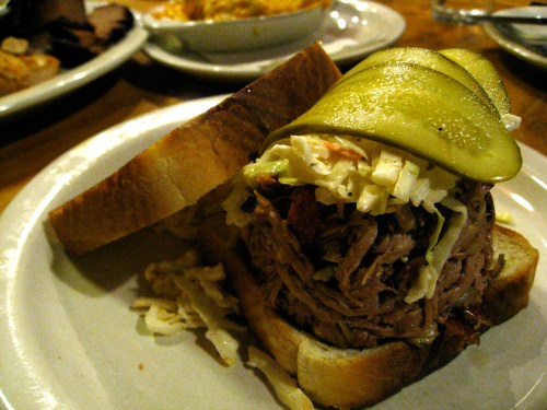 After we finally got a table, we ordered several items from the menu to sample a little bit of everything. By far the best thing we ate was “The Reason” – Niman Ranch pork butt, smoked slow and pulled, bathed in Slows sauce and topped with a signature crispy and slightly spicy coleslaw, thin dill pickle strips, and served between two thick slices of Texas toast. With a selection of Slows sauces on the table, we were able to adjust the flavor of everything we ordered to our liking – spicy, sweet, apple-based, mustard-based, and even a seasonal sauce. I would also highly suggest the mac ‘n cheese – an item that is a perfect companion to any good BBQ, Slows uses jumbo macaroni shells and a generous amount of gooey, melty cheese to make each bite truly rewarding.