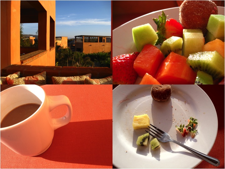 Fri 5am (7am NY): woke up right on body clock cue. Drank triple filtered water. Looked up at my sea blue bed netting that was more romantic decor than purposeful bug-catcher at this time of year. Rolled over and willed myself back to sleep. Fri 7am: Wake up round two. Opened the curtains and stepped out onto my private balcony. The evening desert chill is still in the air as the sun is in its low rise. Grabbed a blanket, my book and curled up on my private outdoor lounging bed, listening to the fountain below. This is a way everyone should start everyday. Fri 8am: Roosters are crowing in a distance field, the air is warming. Check outside my hotel room door. Complimentary breakfast has arrived. Array of sweet fruit-tasting fruit. A pot of steaming freshly-pressed Mexican coffee and a charming woven basket housing two cinnamon-sugar dusted donuts. Joy. I read, sip, nibble and, of course, snap a few shots.